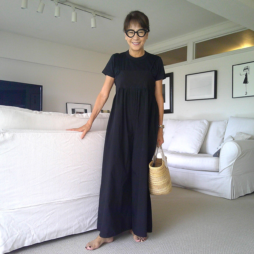 オーバーオールは全体を黒でまとめてスッキリ大人仕様に