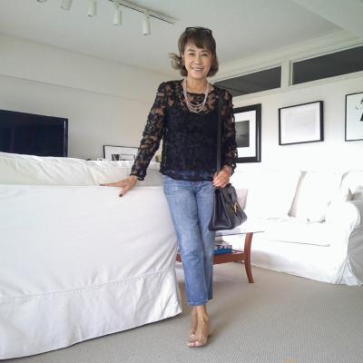 デニムにレースのトップス。こんな意外な組み合わせが楽しい!