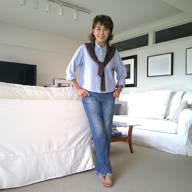 ショート丈のシャツにストレートデニムで今年っぽい大人カジュアル