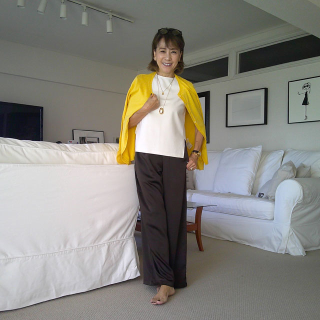 ダークブラウンのワイドパンツを黄色いカーデとゴールドのアクセサリーで元気に