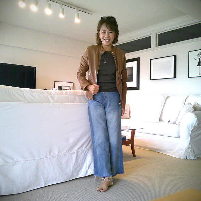 ワイドデニムがいまの気分。コンパクトなブラウンのレザーブルゾンを合わせて