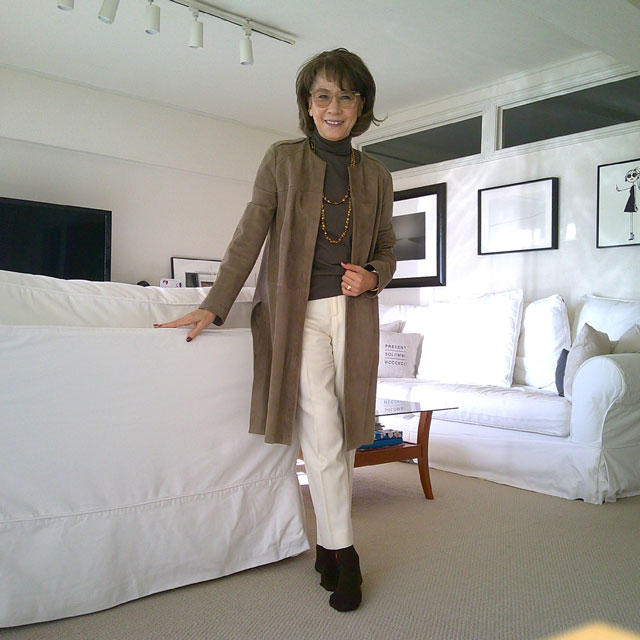 マックスマーラらしいスエードのノーカラーコートを大人っぽくスタイリング