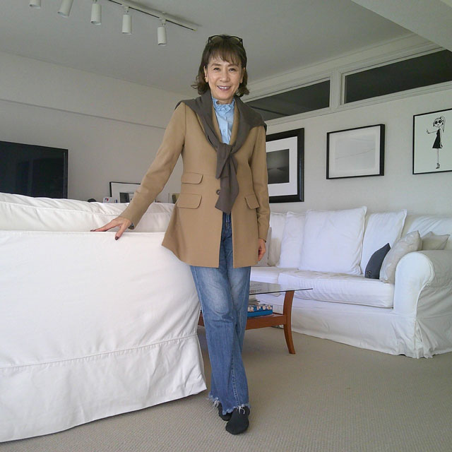 キャメルカラーのジャケットにはブルーを合わせるのが今の気分