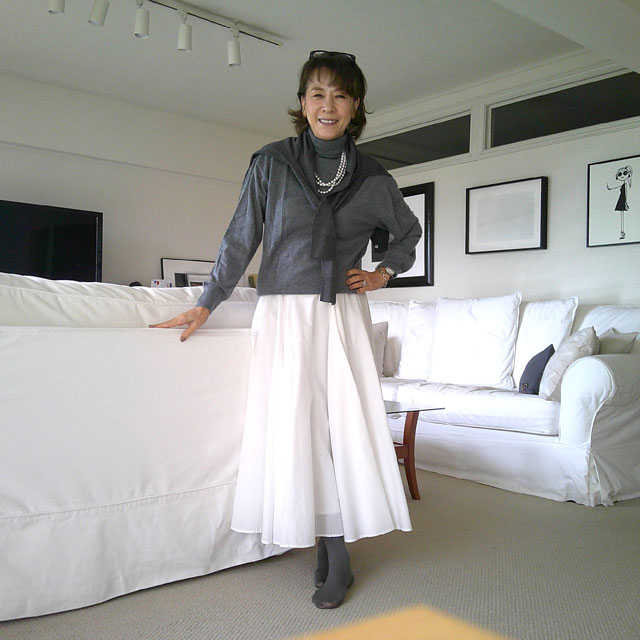 何と合わせても好きなスタイリングが出来あがる白のコットンスカートはまだまだ活躍中