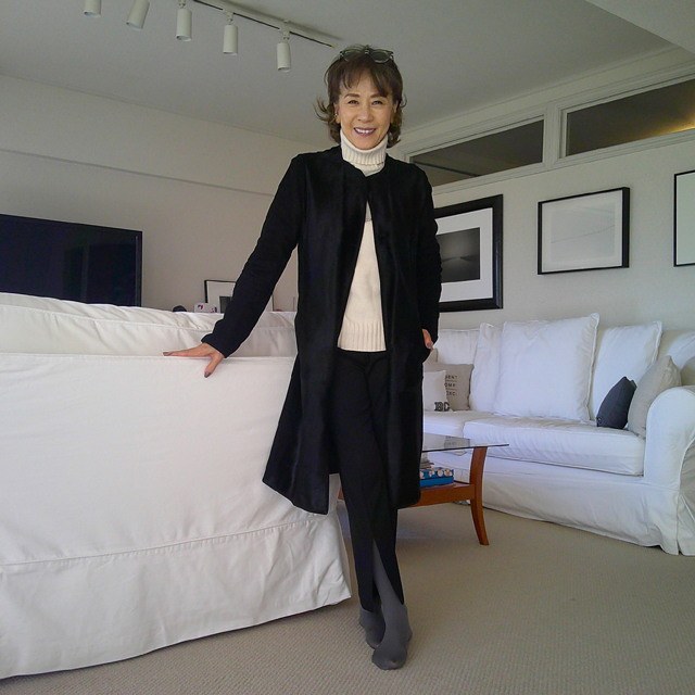 ノーカラーのスエードコートはMaxMaraらしい女性っぽさが満載