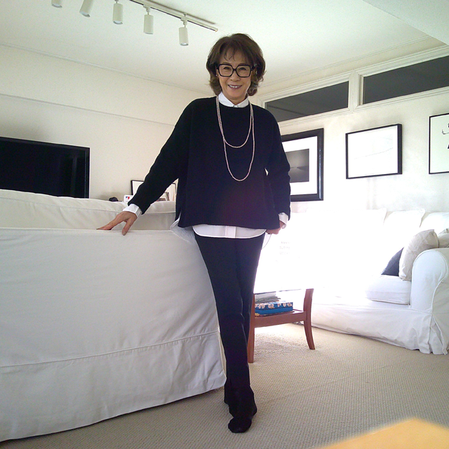 白のオーバーシャツに黒のクルーネックニットを合わせるとセリーヌ風に