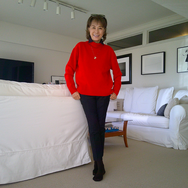 紺ベースに赤いドットのシャツ。赤のニットを重ねて元気なスタイリングに