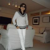 春らしいブルーのVネックセーター。色が綺麗だと表情も優しく見えるみたい。