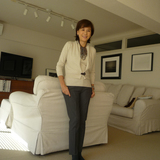 白いノーカラーブラウスは茶のネックレスで少し女らしく