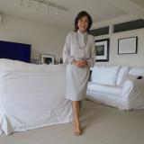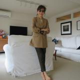 麻のV開きロングジャケットはアースカラーがお気に入り。