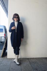 オフショルダーのコートは、レースアップブーツで遊んで。