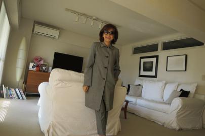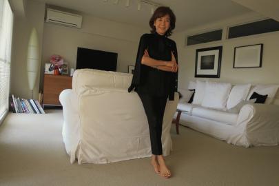 麻のV開きロングジャケットはアースカラーがお気に入り。