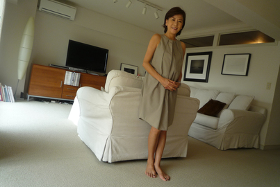 久しぶりに着た生成りのロングドレス。ラメ入りのモスグリーンのストールで女らしく。